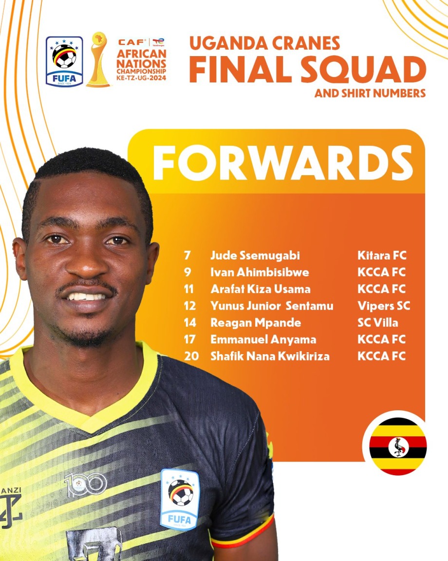 Forwards: 7 Jude Ssemugabi (Kitara FC), 9 Ivan Ahimbisibwe (KCCA FC), 11 Arafat Kiza Usama (KCCA FC), 12 Yunus Junior Sentamu (Vipers SC), 14 Reagan Mpande (SC Villa), 17 Emmanuel Anyama (KCCA FC) and 20 Shafik Nana Kwikiriza (KCCA FC).