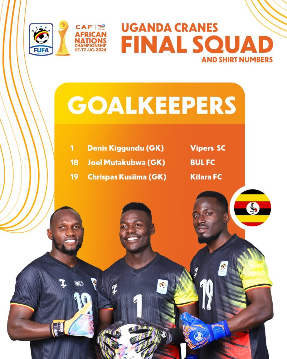 Goalkeepers: 1 Denis Kiggundu (Vipers SC), 18 Joel Mutakubwa (BUL FC) and 19 Chrispas Kusiima (Kitara FC)