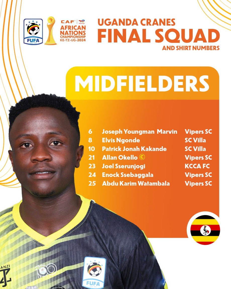 Midfielders: 6 Joseph Youngman Marvin (Vipers SC), 8 Elvis Ngonde (SC Villa), 10 Patrick Jonah Kakande (SC Villa), 21 Allan Okello © (KCCA FC), 23 Joel Sserunjogi (KCCA FC), 24 Enock Ssebagala (Vipers SC) and 25 Abdu Karim Watambala.