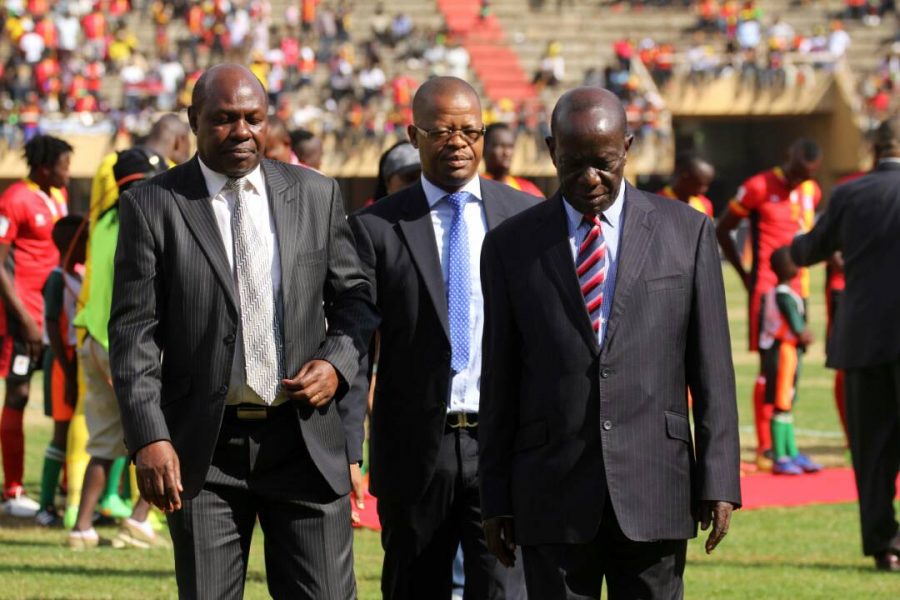 L-R: State Sports Minister Charles Bakabulindi, FUFA President Eng. Moses Magogo and Vice President Edward Kiwanuka Ssekandi shortly after inspecting the teams