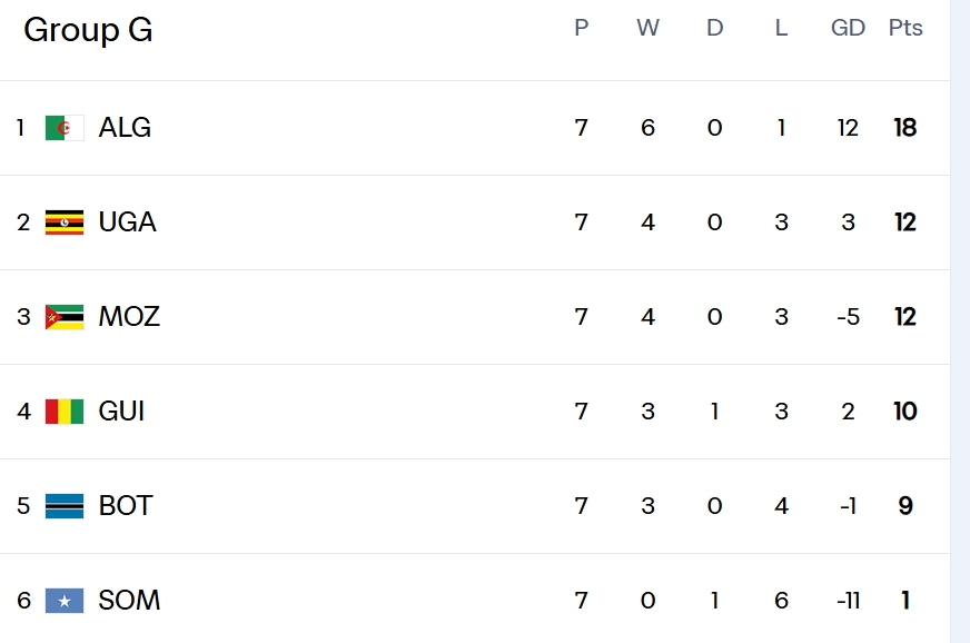 The result lifts Uganda to 12 points from seven matches, level with Mozambique but ahead on goal difference. Algeria lead the group with 18 points, while Guinea and Botswana have ten and nine points respectively. Somalia sit bottom with a single point.