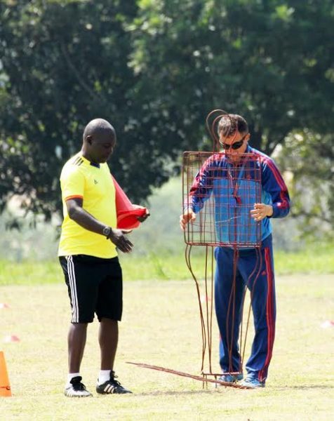 Micho (right) and his assistant Fred Kajoba as they prepare the field of play prior to the Tuesday mid-morning session at IUIU Girls Campus in Kabojja