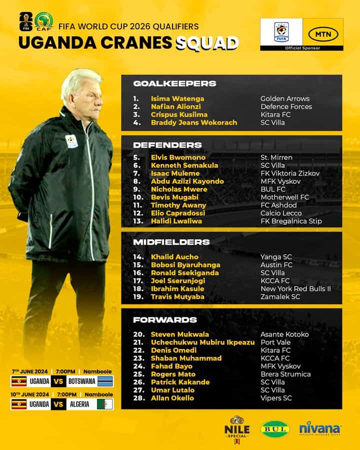 The coach revealed the squad on Thursday in a press conference held at FUFA Complex in Mengo, Kampala.
