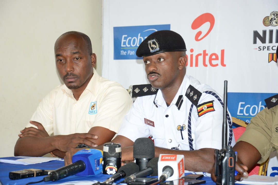 Kampala Metropolitan Traffic Police Commander, Norman Musinga address the media as the FUFA Communications manager Ahmed Hussein looks on