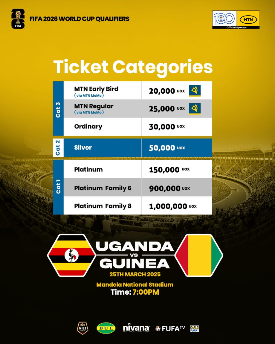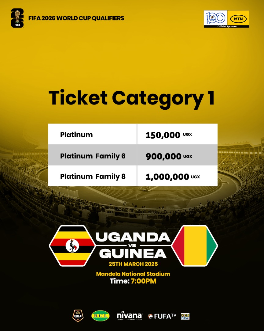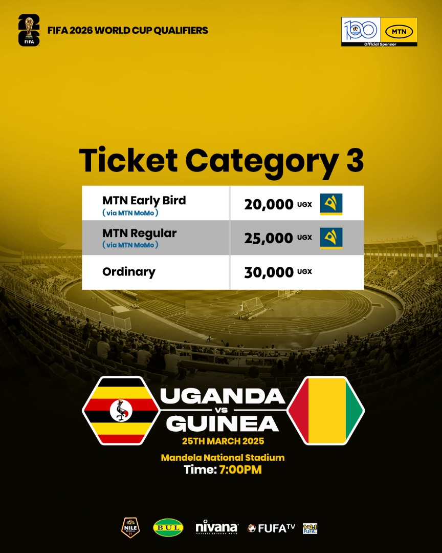 The Federation of Uganda Football Associations (FUFA) has officially released ticketing details for the highly anticipated FIFA World Cup 2026 Qualifier match between Uganda and Guinea, scheduled for 25th March 2025, at Mandela National Stadium. The match will kick off at 7:00 pm, and fans are encouraged to secure their tickets early to avoid last-minute rush.
