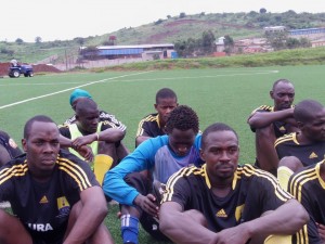 Alishe (seated extreme left) in a training at the Technical Centre in Njeru. The committed player will miss his honeymoon because of the Cecafa-Kagame tournament in Dar es salaam.
