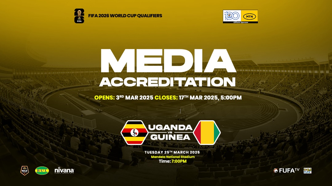 FUFA wishes to inform members of the sports media that the application process for accreditation to cover the 2026 FIFA World Cup Qualifier match between Uganda and Guinea at Mandela National Stadium on the 25th March 2025 is now open via the FUFA Media Channel on https://fufa.co.ug/media/login/