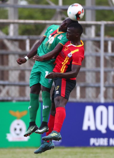 Lameck Banda of Zambia battles for the ball with Muhammad Kasule of Uganda during the 2017 COSAFA U20 football match between Zambia and Uganda at Arthur Davis Stadium, Kitwe on 6 December 2017 ©Chris Ricco/BackpagePix