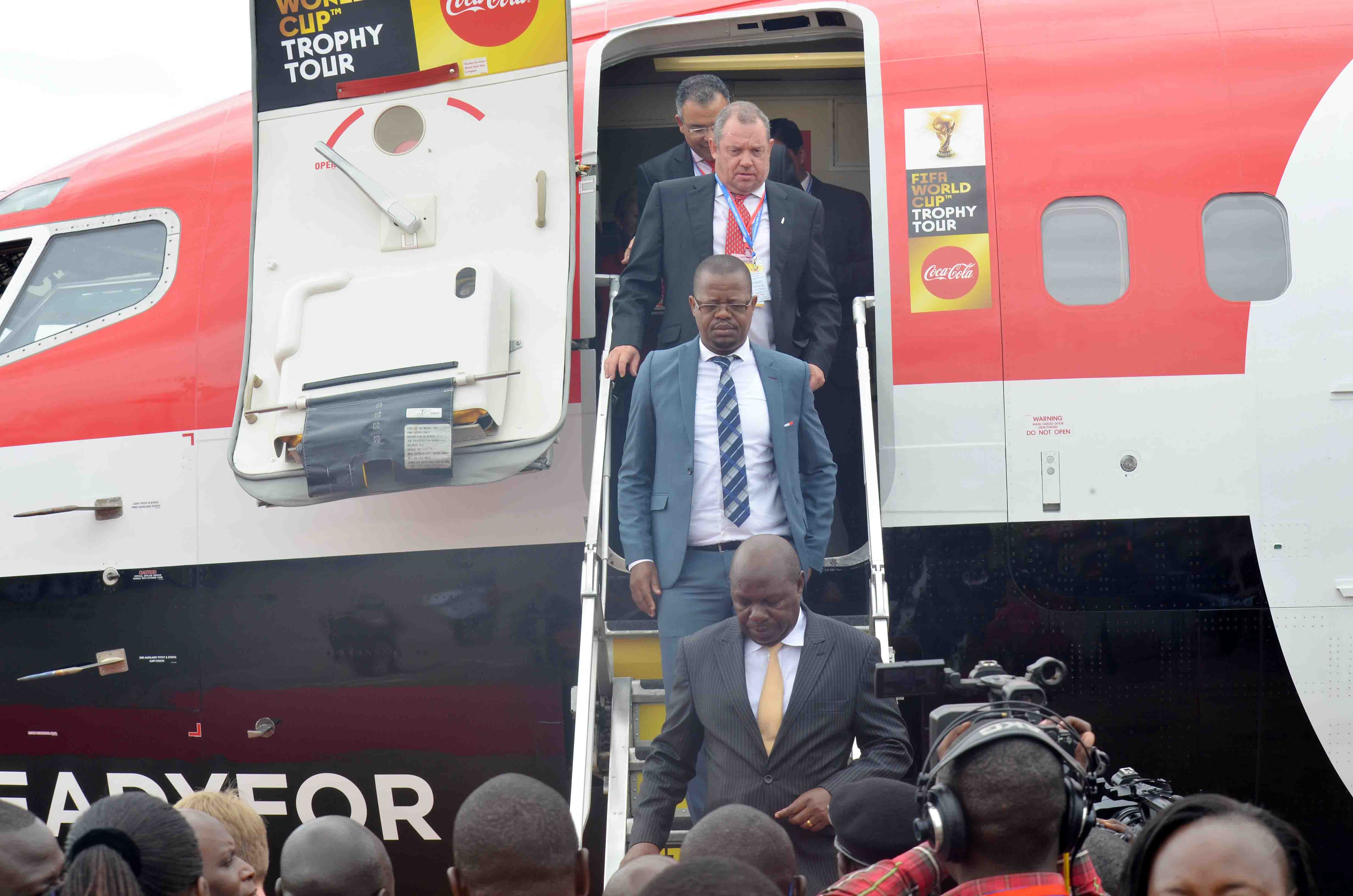 FUFA President Eng. Moses Magogo was among the high profile dignitaries who received the FIFA World Cup trophy at Entebbe International Airport on Monday morning.