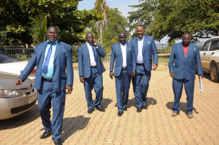 MAIN PHOTO:  Dr. Patrcik Bernard Ogwel (L) is the head of the FUFA Licensing Committee. In the photo, he is seen with other FUFA Executive members (L-R) Rasuol Ariga, Ochom Richard, Hamid Juma and Sam Lwere getting set for the FUFA General Assembly in Soroti.