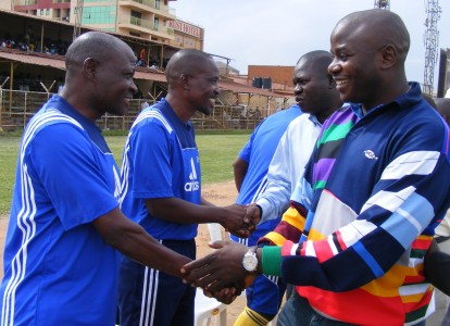 FUFA Finance Vice President Anthony Kimuli and Ogwel Patrick (VP Youth) sharing a joyful moment with U20 head coach Paul Nkata and his assistant Abdalllah Mubiru before Uganda walloped Mozambique 4-0 @befoi