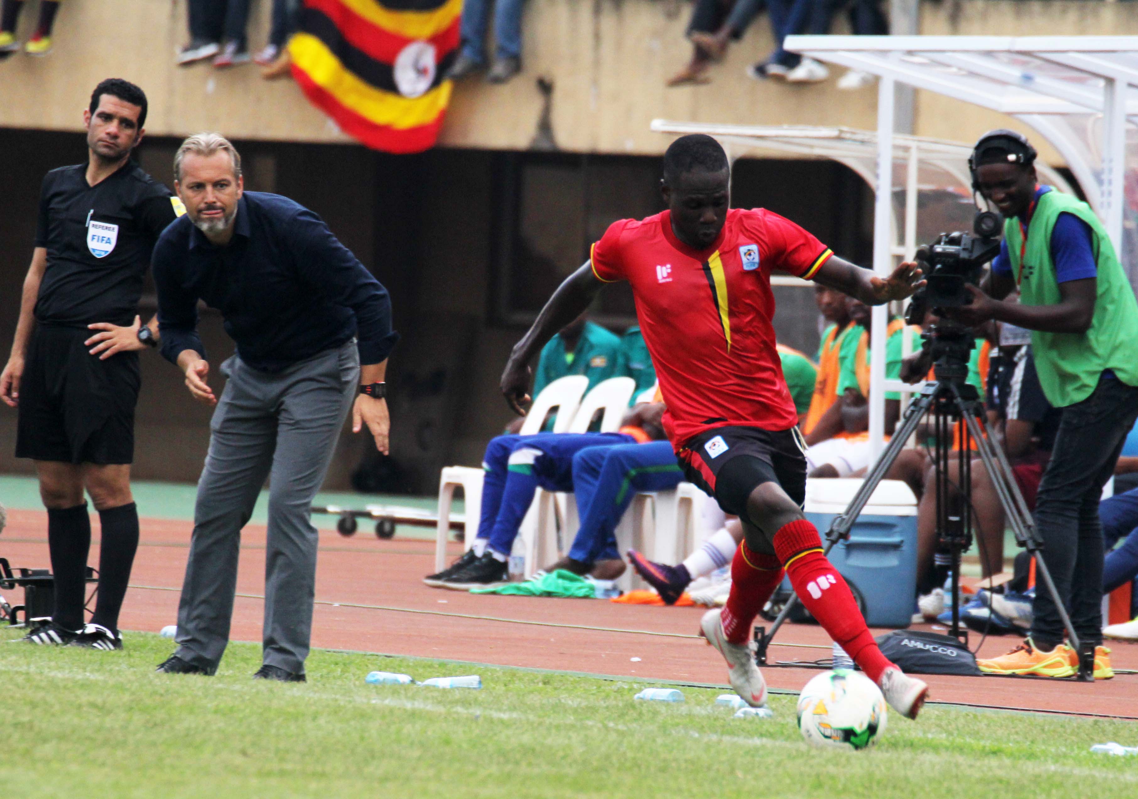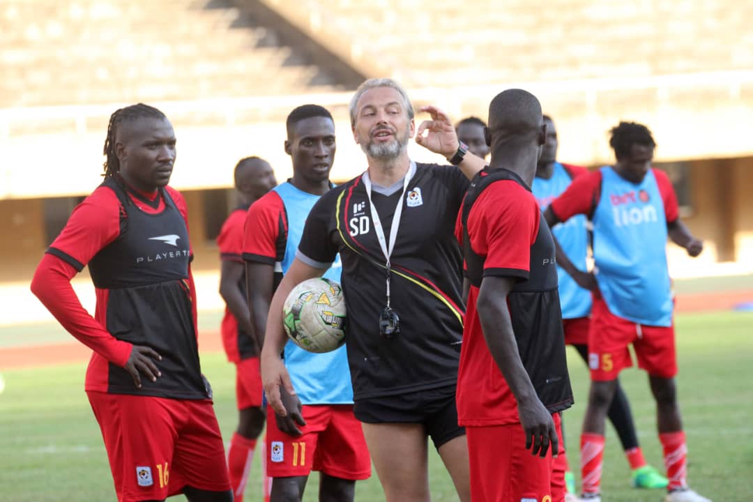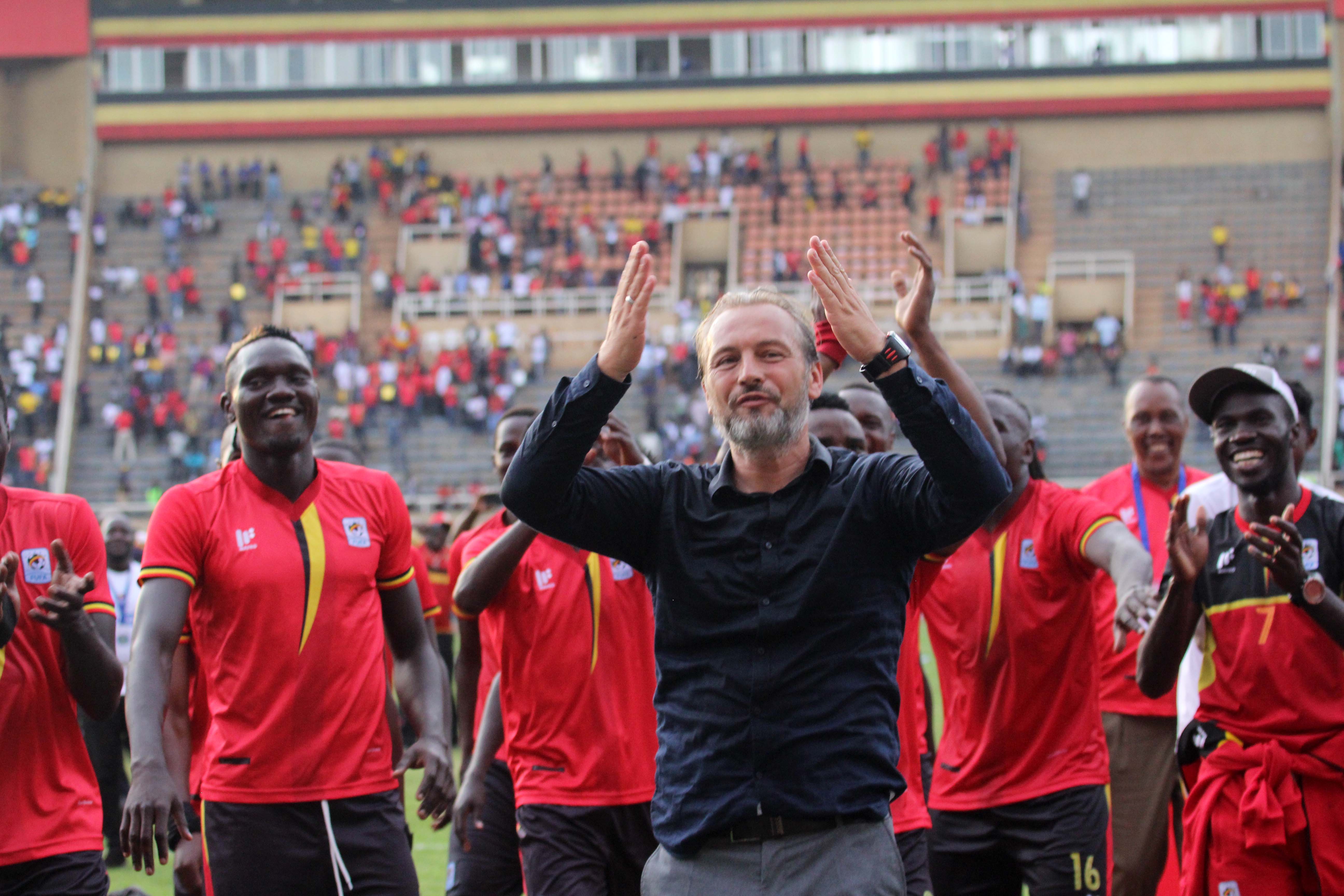 Striker Nelson Senkatuka attempts to dribble past head coach Sebastien Desabre in training while in MoroccoDesabre talks to Allan Kateregga and defender Murushid JjuukoNoel Nasasira (left) recieves his FUFA Big League accolade from Desabre at the Airtel FUFA Awards 2018Always keen: Coach Desabre watches over trainingHead coach Sebastien Desabre in the new team officials’ attireHead coach Sebastien Desabre (in black holding the ball) issues instructions during the team’s training at Namboole StadiumHead coach Desabre poses for a group photo with aspiring young players during Uganda Cranes national regional tours in Bugiri Eastern UgandaDesabre keenly looks on as Faruku Miya dribbles during the Cape Verde match at NambooleMemorable Moment: Uganda Cranes players carry aloft the coach after sealing the Total AFCON 2019 slot at Namboole StadiumThe coach enjoys a light moment with school children during a Uganda Cranes regional tourUganda Cranes coach Sebastien Desabre issuing instructions during training at LugogoThe coach is joined by the Uganda Cranes players to applaud the fans after sealing the ticket to the 2019 AFCON Finals.