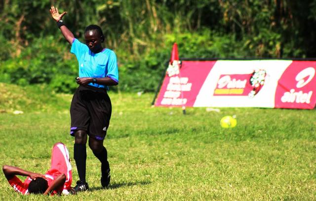 Main Photo: FUFA Female Referee, Anna Akoyi officating at the Airtel Rising Stars Season IV girls football.