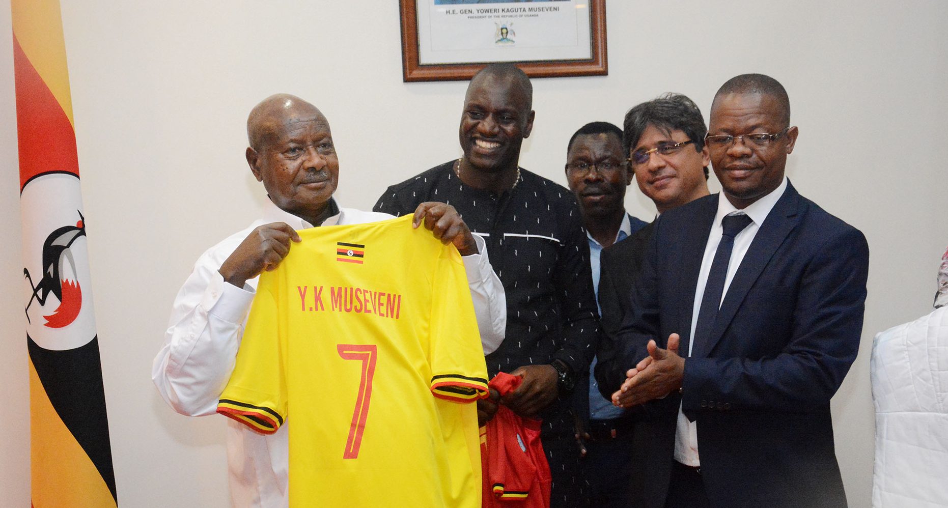 The President of the Republic of Uganda Yoweri Kaguta Museveni receives the highest of Honor in local football-an award presented to him by FUFA President Eng. Moses Magogo on Monday evening at State House Entebbe.